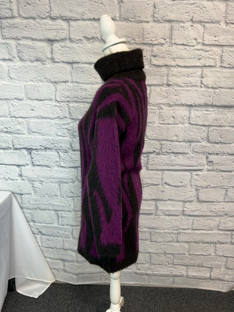 This striking 8 by YOOX sweater dress features a bold zebra pattern in rich brown and purple tones, perfect for making a sophisticated statement. New with tags, this XS piece combines contemporary style with classic knitwear appeal—ideal for transitional seasons or layered winter looks.