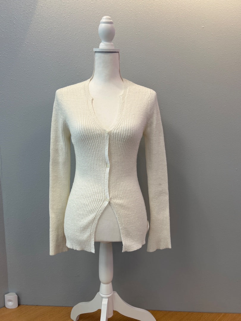 This A.L.C. size large cardigan in cream ribbed texture delivers sophisticated layering versatility with refined minimalist design. The ribbed knit construction provides subtle visual texture and structural support, creating a garment that maintains its shape while offering comfortable movement and breathability. The cream colorway serves as a foundational neutral that pairs effortlessly with virtually any piece in your wardrobe, from denim and tailored trousers to slip dresses and patterned skirts. The three-button closure offers functional elegance and allows customizable styling options—wear it fully buttoned for polished structure or open for relaxed layering flexibility. A.L.C.'s commitment to quality construction and contemporary design shines through in the meticulous attention to detail and premium fabric selection. The structured yet comfortable fit works beautifully across professional, casual, and elevated occasions, providing reliable versatility for countless outfit combinations. In excellent condition, this piece exemplifies the investment value of timeless basics crafted with precision and care. Whether layered over fitted tees, paired with tailored silhouettes for professional polish, or worn open over slip dresses for elevated ease, this ribbed cream cardigan delivers the understated sophistication and enduring quality that defines a well-curated wardrobe foundation.