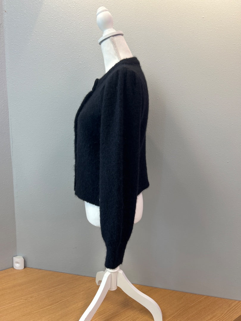 This Anine Bing size small cardigan in black wool blend delivers refined elegance with versatile layering potential. The luxurious wool blend fabric combines natural warmth with softness, creating a garment that feels as good as it looks while resisting excessive wrinkling and pilling. The cropped silhouette offers contemporary proportions that work beautifully with high-waisted bottoms, creati... read more