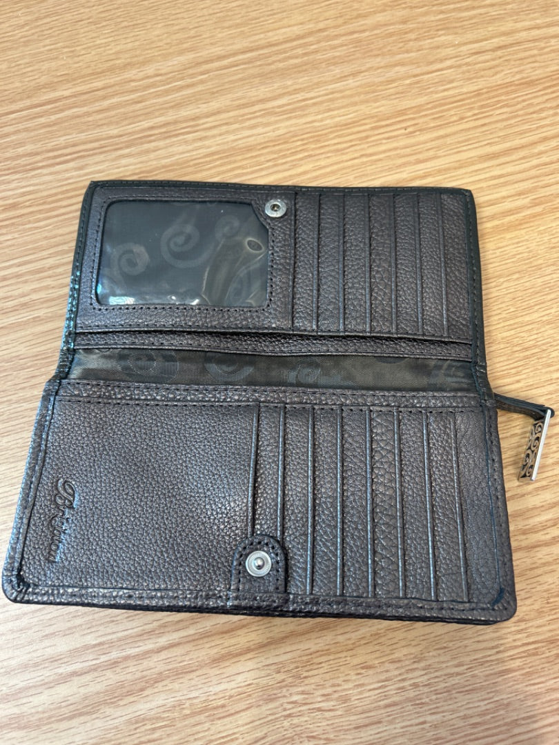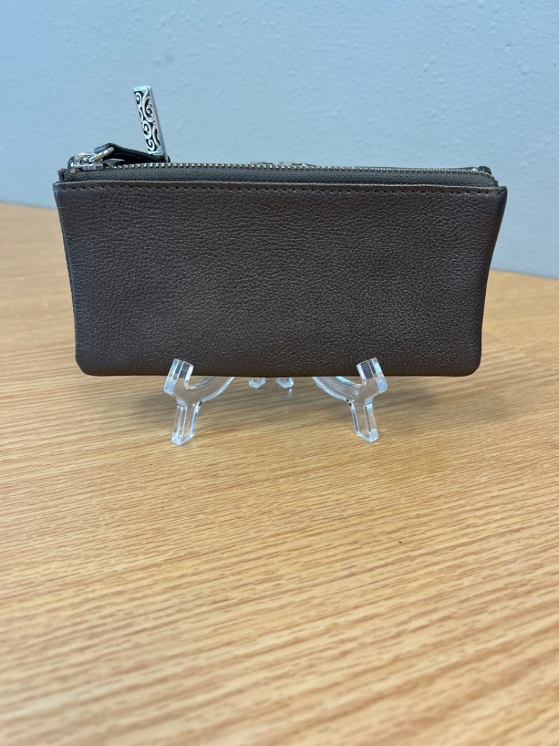 This Brighton wallet in rich brown leather showcases the brand's signature craftsmanship with understated luxury details. Genuine leather develops a beautiful patina over time, becoming more personalized with each use. Silver-tone studs add subtle embellishment and visual interest without overwhelming the refined aesthetic, while the dual fold design provides efficient organization for cards, bills, and essentials. The snap closure ensures secure fastening and protects contents during daily use. In excellent condition, this piece demonstrates quality construction and attention to detail characteristic of Brighton's heritage brand positioning. The neutral brown leather pairs effortlessly with any color palette or style, making it a versatile accessory that complements both casual and polished looks. An investment in timeless design that transcends seasonal trends.