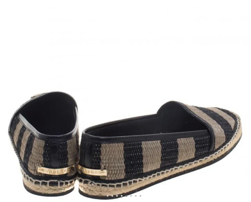 Step out in style this summer with these trendy espadrilles from Burberry. Featuring a striped raffia exterior, this trendy almond-toe pair has braided jute details on the midsole and leather-lined interiors. They also carry the brand's nameplate in gold-tone at the rear. Soak up the sun by slipping these on with shorts and pastel dresses.
