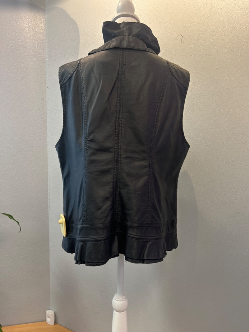 Add dramatic flair to your wardrobe with this striking faux leather ruffle neck vest from Charlie Paige. Designed in an XL size, this statement piece showcases luxe faux leather paired with an eye-catching ruffled neckline that commands attention. The sleeveless silhouette layers beautifully over fitted tees, crisp button-downs, or flowing blouses, offering endless styling possibilities. Faux l... read more