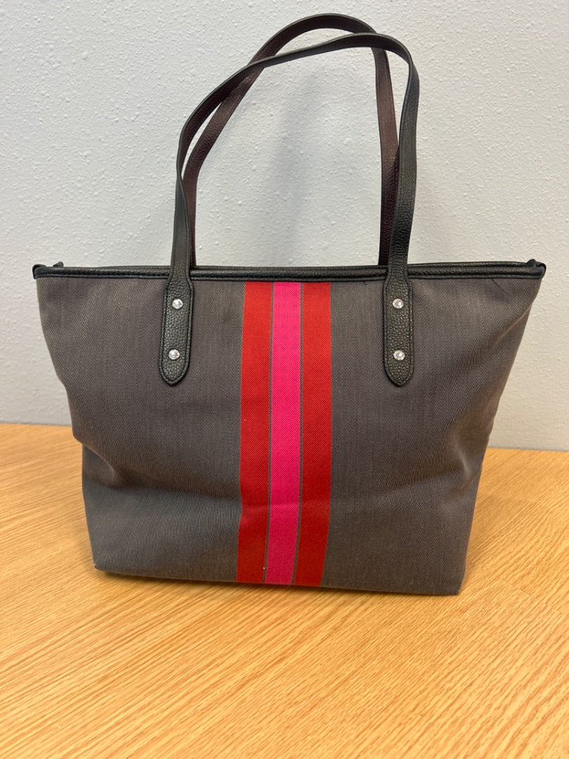 Coach grey/red/pink jacquard tote with stripes and carriage logo