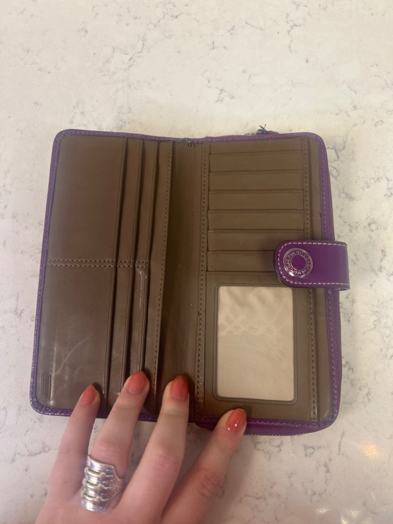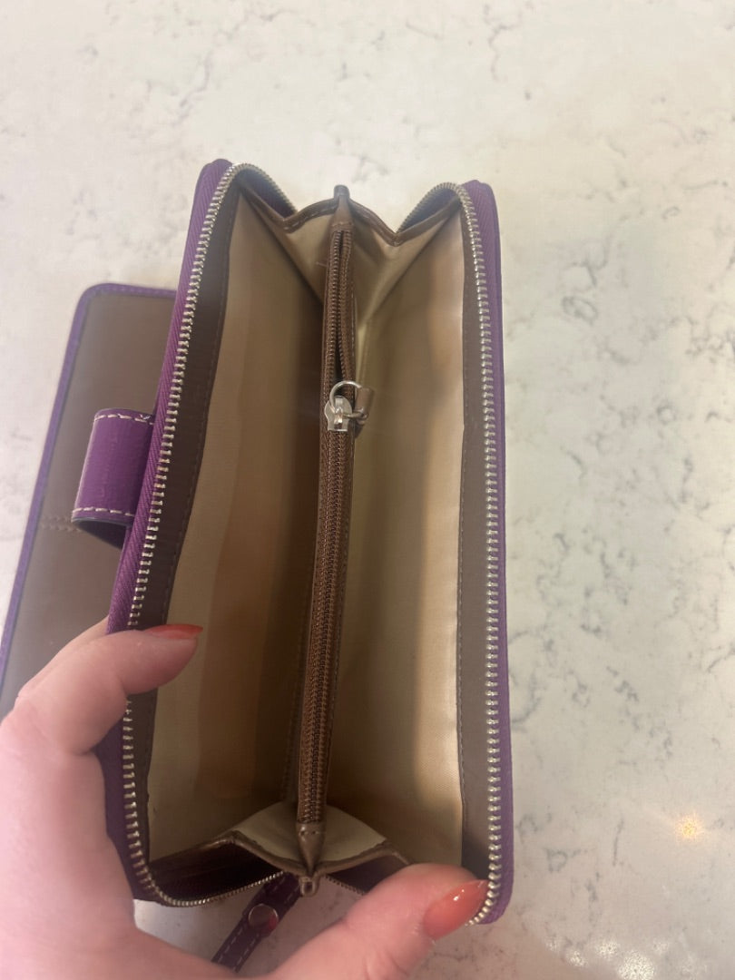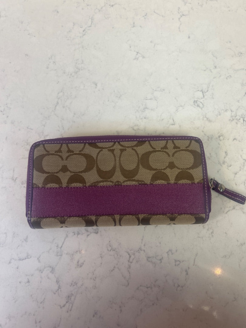 This Coach trifold zip wallet combines timeless design with practical functionality. The signature CC canvas pattern in tan provides a classic foundation, while purple accents add a sophisticated pop of color. The trifold structure with secure zip closure keeps your essentials organized and protected, while polished silver hardware complements the refined aesthetic. An ideal choice for those se... read more