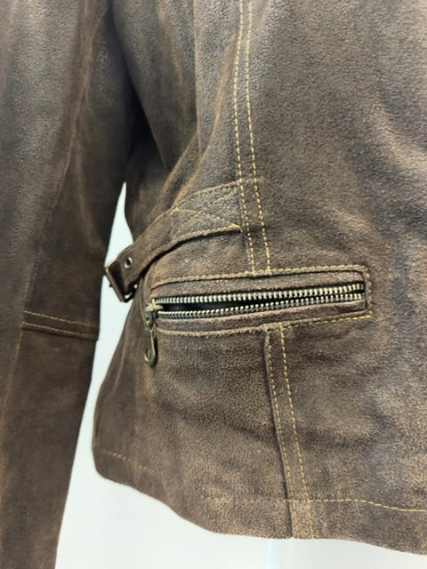 Classic brown leather biker jacket crafted for timeless style and durability. The structured silhouette features authentic moto detailing—zippered pockets, adjustable waist tabs, and a robust front zipper—designed to withstand years of wear. Premium leather develops character over time, creating a personalized patina unique to each wearer. An essential wardrobe staple that transitions seamlessl... read more