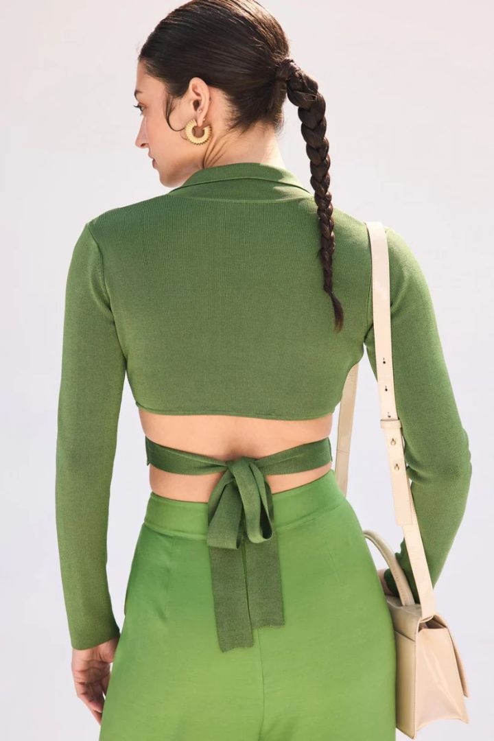 Brand new from Cult Gaia, a stylish alternative to your usual tees and pullovers, this figure-skimming Cult Gaia crop top features a unique wrap silhouette and a fold-over collar. Available in the color basil, the cropped profile and tie closure at the waist make this top the perfect addition to your summer wardrobe!