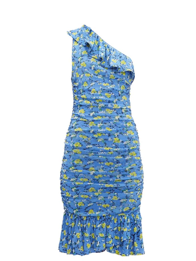 New with tags, the "Aerin" dress in Ditsy Vines Baja Blue. The yellow buttercup print on this dress perfectly contrasts the blue mesh construction, offering a summer feel that's accentuated by the one-shoulder silhouette and charming ruffle trim. Ruched across the entire bodice, it's flattering and offers slight stretch for a comfortable fit, while the complementary blue lining ensures ample coverage. Team it with white accessories to attend a summer wedding.