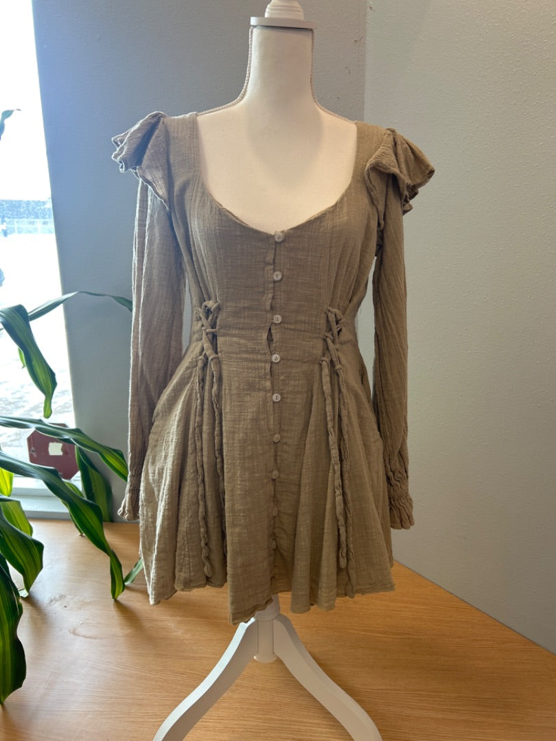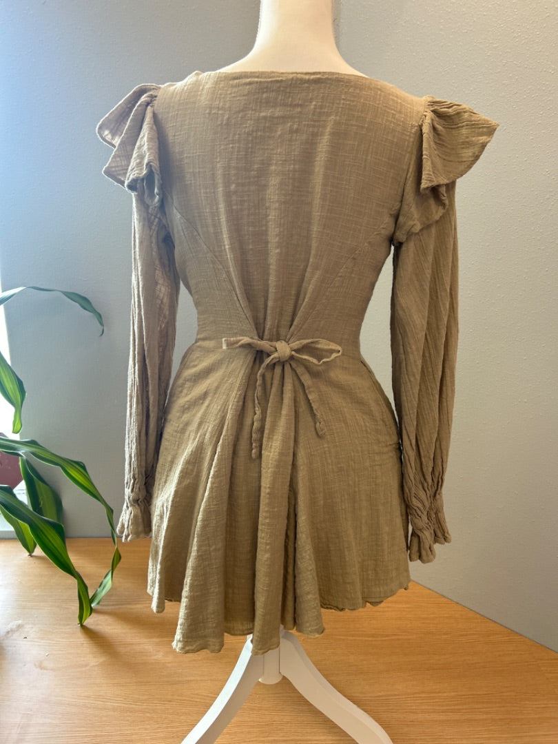 Free People S Tan LONG LS top w/ ruffle shoulders/waist ties