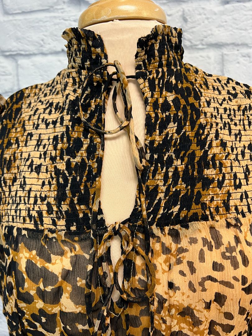 Embrace bohemian elegance with this Free People Size S Roma Sheer Blouse in Leopard, brand new with tags, featuring a sophisticated mock turtleneck with adjustable ties. The sheer fabrication introduces contemporary transparency and visual interest while the leopard print adds personality and distinctive style. The mock turtleneck provides coverage and structure while the adjustable ties allow ... read more
