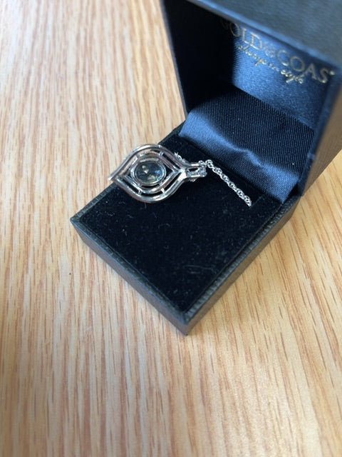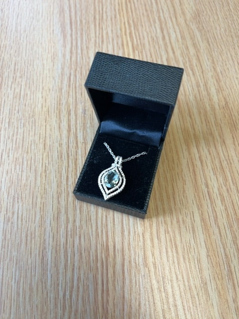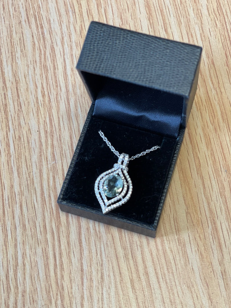Green amethyst takes center stage in this striking necklace, showcasing a substantial oval crystal suspended from a refined silver fine rope chain. Delicate faux diamonds encircle the teardrop silhouette, amplifying its luminous appeal. Presented new in box, this piece combines sophisticated craftsmanship with accessible luxury—ideal for elevating everyday wear or making a refined statement at special occasions.