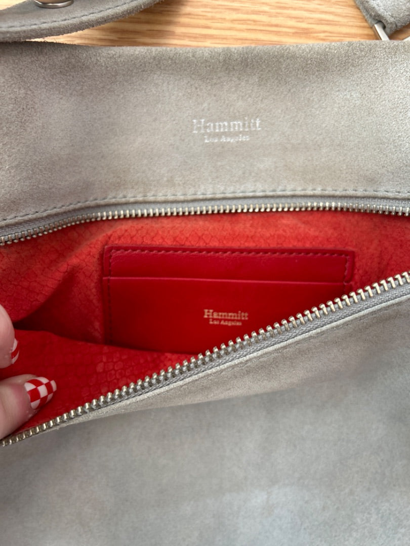 This Hammitt crossbody bag combines understated elegance with functional design, featuring a soft gray suede construction that develops a beautiful patina with wear. The clean rectangular silhouette provides a modern aesthetic while maximizing interior space for your daily essentials, complemented by distinctive silver metalwork that adds architectural interest without overwhelming the minimali... read more