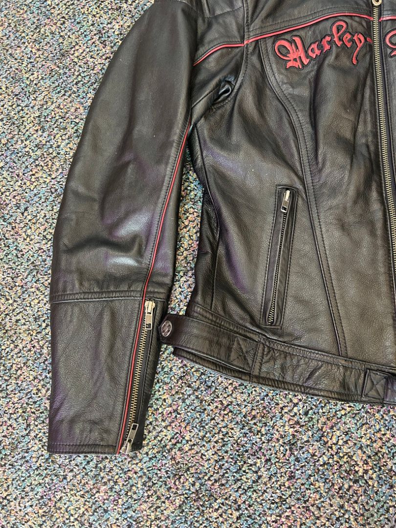 The "Women's Moto Leather Jacket" from Harley Davidson features a classic and timeless jacket design. With red leather detailing and several decorative buttons, stitches, and studs, this jacket is the perfect addition to any style! Pair with a simple pair of jeans or a fun skirt for the ideal outfit!