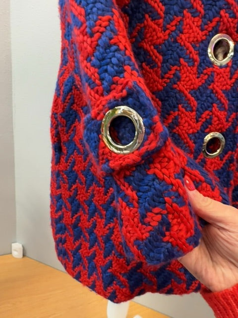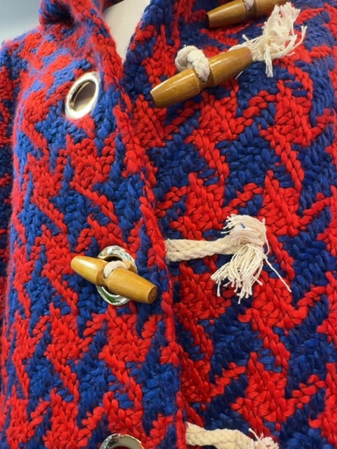 This striking Judith March jacket showcases a classic houndstooth pattern in rich red and purple tones, offering timeless sophistication with contemporary flair. The structured silhouette is enhanced by a coordinating belt that defines the waist, while distinctive tassel button closures add an artisanal touch. Perfect for layering over dresses or pairing with tailored trousers, this piece trans... read more