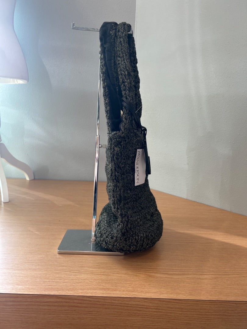 JW Anderson's crochet shopper delivers understated luxury with a contemporary edge. This heavy knit tote in sparkly green features dual handles for comfortable carrying and arrives new with tags. The textured crochet construction offers visual depth while maintaining the minimalist aesthetic JW Anderson is known for. Perfect for those seeking a statement piece that transitions seamlessly from d... read more