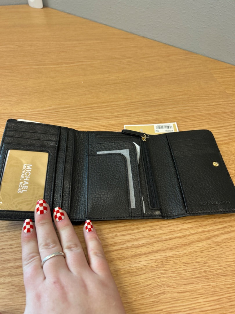 This Michael Kors trifold wallet in sleek black leather offers pristine, never-worn quality with modern organizational design. Genuine leather construction promises durability and develops character with time, while the trifold configuration maximizes compartmentalization for bills, cards, and coins in a structured layout. Gold-tone hardware provides elegant detailing that coordinates seamlessly with both contemporary and classic accessories. The compact yet spacious design balances functionality with portability, making it ideal for those who prefer streamlined everyday carry. New with tags, this wallet represents an exceptional value for a designer piece that combines timeless aesthetics with practical engineering. Perfect for gifting or upgrading your everyday essentials with a luxury accessory that delivers both style and substance.