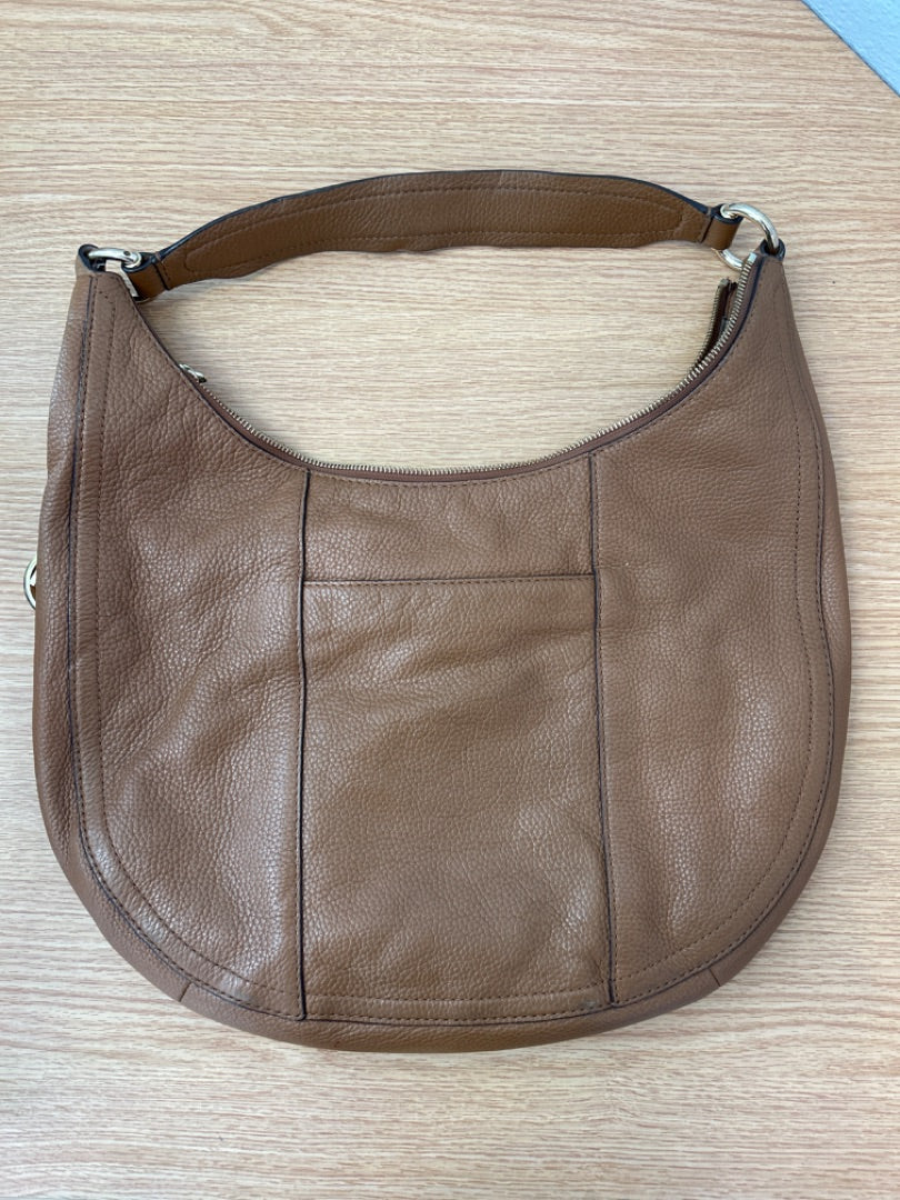 Elevate your everyday carry with this Michael Kors tan crescent pebble leather shoulder bag, a sophisticated staple crafted from genuine pebbled leather. The spacious large silhouette accommodates your daily essentials while maintaining an elegant profile, complemented by polished gold-tone hardware that adds a touch of luxury. The structured crescent shape provides both visual interest and practical organization. This pre-loved piece shows minimal wear with only a small handle imperfection, making it an excellent choice for the discerning shopper seeking authentic designer quality at an accessible price point. Perfect for transitioning from office to evening occasions.