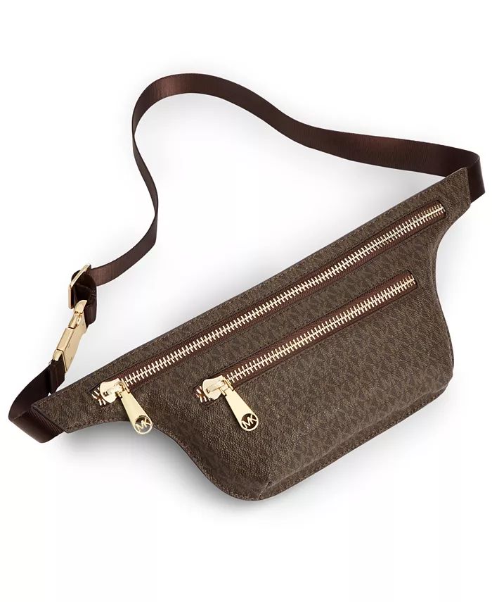 Fabric: Leather, Nylon Elevate your everyday carry with this Michael Kors "Logo Double Zip" fanny pack, expertly crafted from premium leather and nylon for durability and refined style. The signature logo-print design delivers contemporary sophistication, while polished gold-tone hardware and a secure speed-clip belt buckle ensure both aesthetic appeal and functional reliability. Dual zippered ... read more