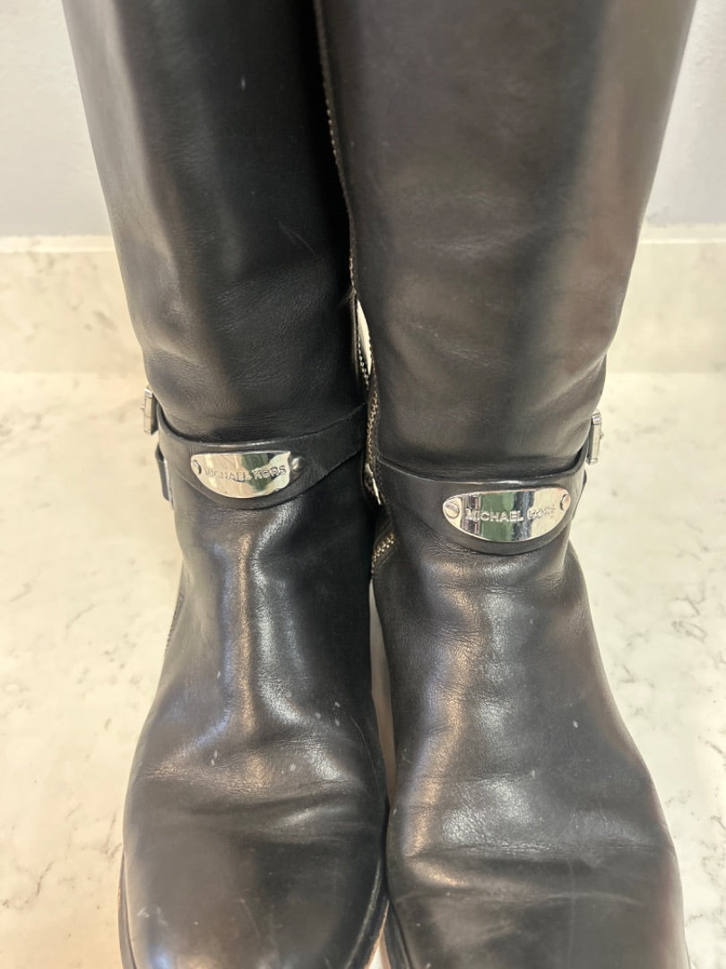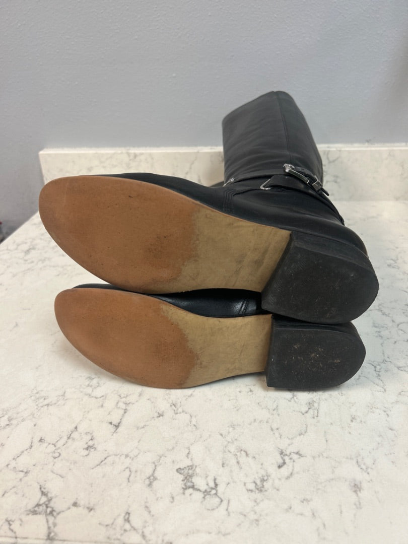 These MMK women's boots in size 7.5 feature a striking tall leather silhouette accented with a buckle detail and distinctive silver brand logo that signals quality craftsmanship. The generous height provides excellent coverage and support, making these boots ideal for layering with various outfits throughout the seasons. The buckle accent combines functional adjustability with visual interest, ... read more