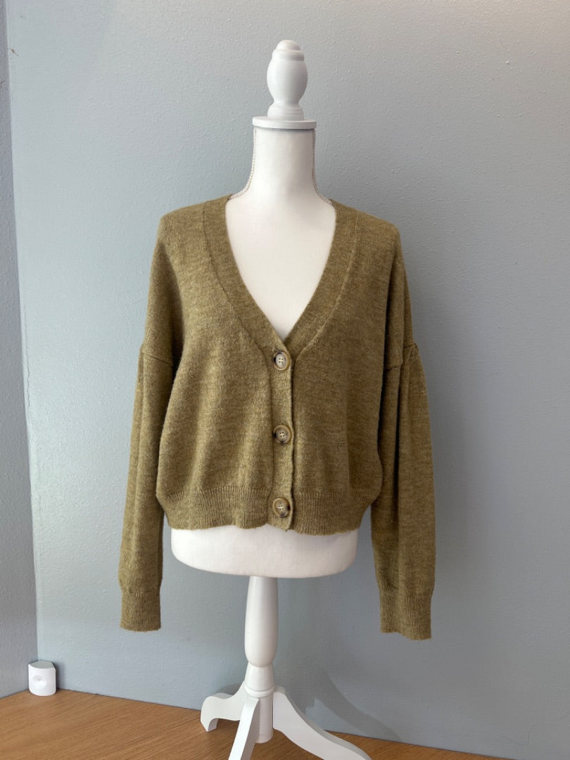 Discover effortless layering with this Mod Ref size L cardigan, a contemporary knit piece that celebrates understated elegance through refined construction. Rendered in a sophisticated olive green hue, this cardigan offers a versatile palette that complements both neutral and colorful wardrobe foundations. The three-button front closure provides adjustable styling options, allowing you to wear the piece fully buttoned for polished occasions or open for relaxed, layered looks. The cropped length creates a modern silhouette that pairs beautifully with high-waisted bottoms or worn as a standalone piece, offering visual balance and contemporary proportions. The quality knit fabrication ensures comfortable wear while maintaining structural integrity through regular use, reflecting Mod Ref's commitment to thoughtful design and accessible luxury. The streamlined construction avoids unnecessary embellishment, allowing the piece's clean lines and flattering fit to take center stage. Perfect for those seeking versatile layering pieces that transition seamlessly from casual weekends to professional settings, this cardigan delivers both functional utility and refined style in a silhouette that feels both timeless and distinctly current.