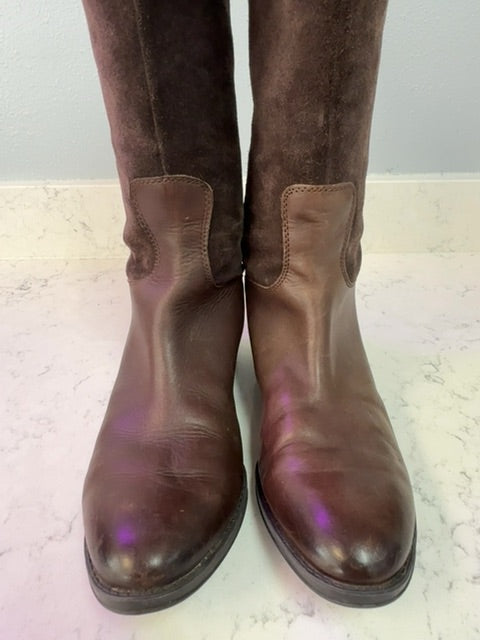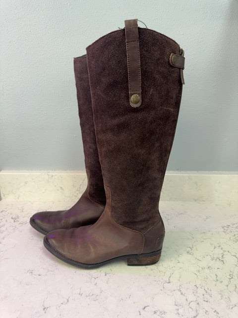 These Sam Edelman knee-high boots combine rich brown suede and leather in a sophisticated silhouette designed for versatile styling. The rounded toe provides comfort and a refined aesthetic that transitions seamlessly from casual to polished looks. Crafted with quality materials, these boots offer the durability and timeless appeal Sam Edelman is known for. Size 7.5 fits true to size. Perfect f... read more