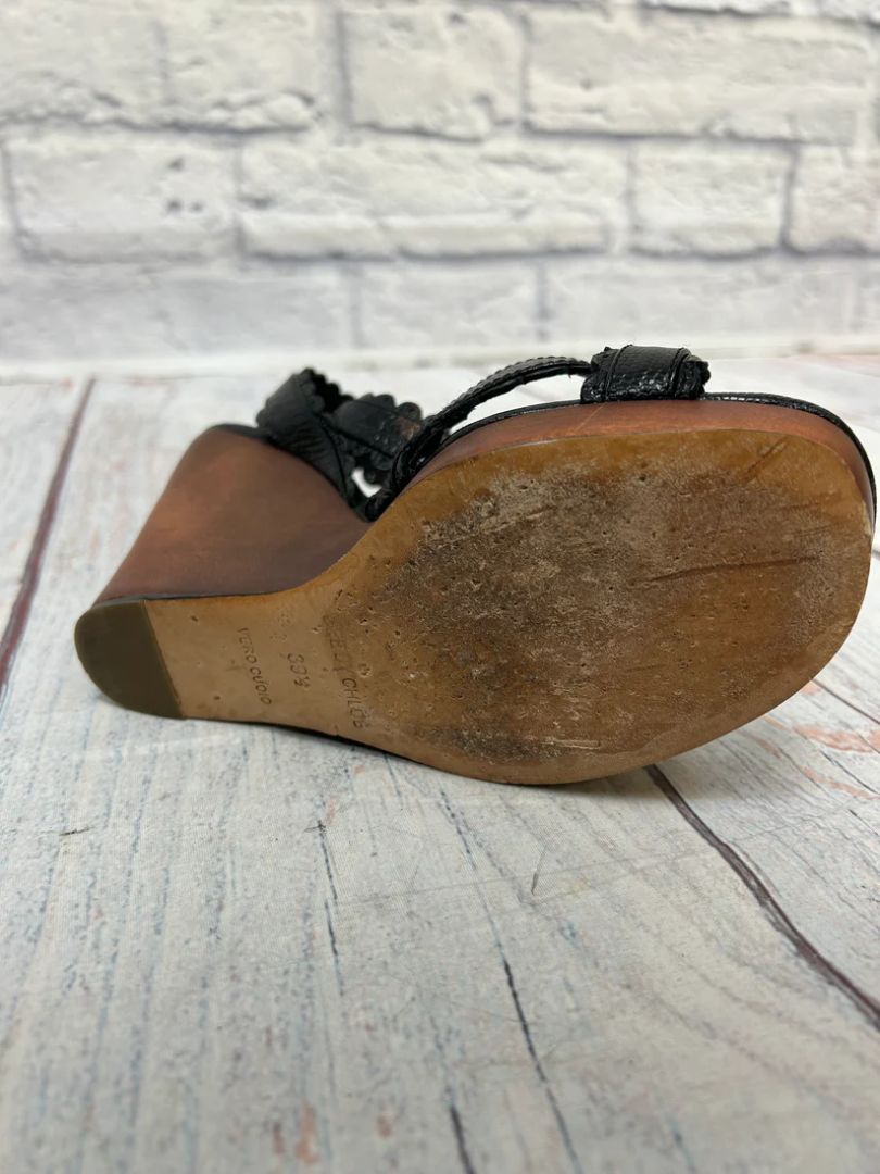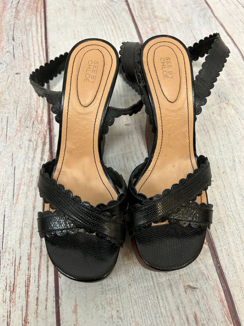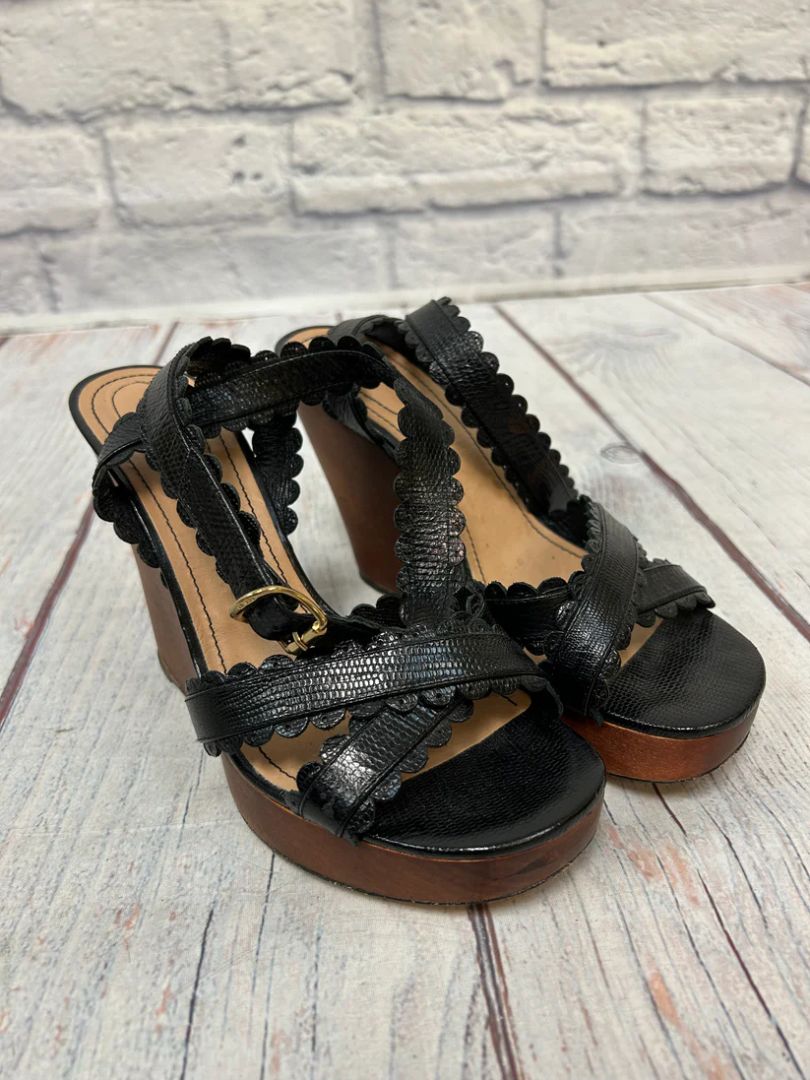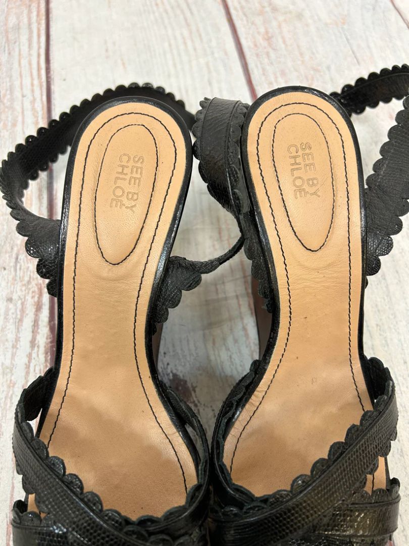 The "Scallop-Strap Wedge Sandal" from See by Chloe feature a strappy and stylish version of a classic wedge sandal. This shoe showcases a scalloped wraparound ankle strap and a smooth wooden wedge. Perfect for any occasion, this pair of shoes is the ideal addition to any outfit!