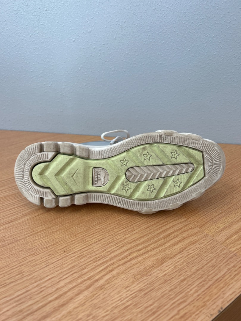 This Sorel platform sneaker combines athletic functionality with contemporary style through its striking silver metallic upper and eye-catching green accents. The lace-up closure ensures a secure, customizable fit, while the white laces provide crisp contrast against the shimmering silver finish. The elevated platform sole delivers both visual impact and practical height, creating an instantly modern silhouette that works across casual and elevated casual contexts. Green lining details add an unexpected pop of color visible when the shoe is worn, demonstrating thoughtful design that rewards closer inspection. Sorel's reputation for durable construction ensures these sneakers withstand daily wear while maintaining their distinctive aesthetic appeal. Sized at 9, this pre-owned pair is in excellent condition and ready for immediate wear. The versatile silver-and-green color story pairs effortlessly with neutral basics, denim, or bold prints, making these sneakers an investment piece that elevates everyday footwear. Whether styled with athleisure separates or dressed up with tailored pieces, these platform sneakers deliver contemporary edge with expert craftsmanship.