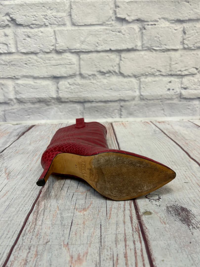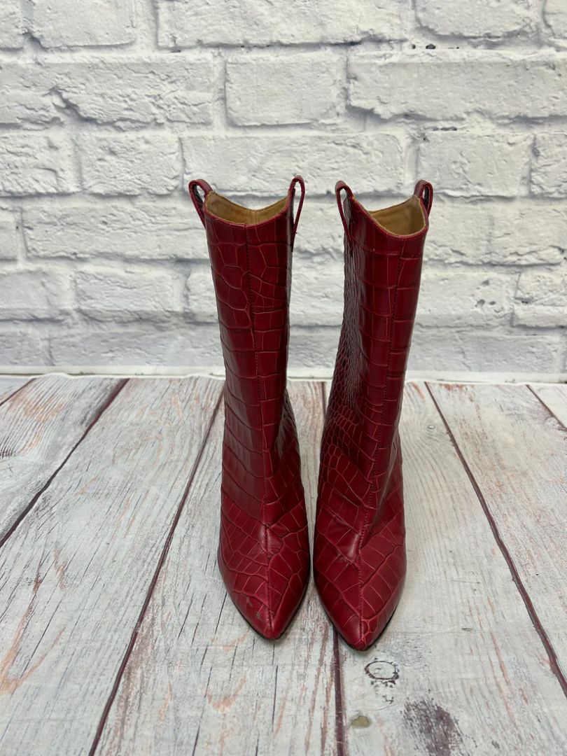 The "Apom Champ Boot" from Toral features pull-on styling, side pull tabs, and a chic pointed toe silhouette. Available in a striking red leather, these boots are sure to be the perfect addition to any style. These boots pair well with a simple trouser or a fun skirt!